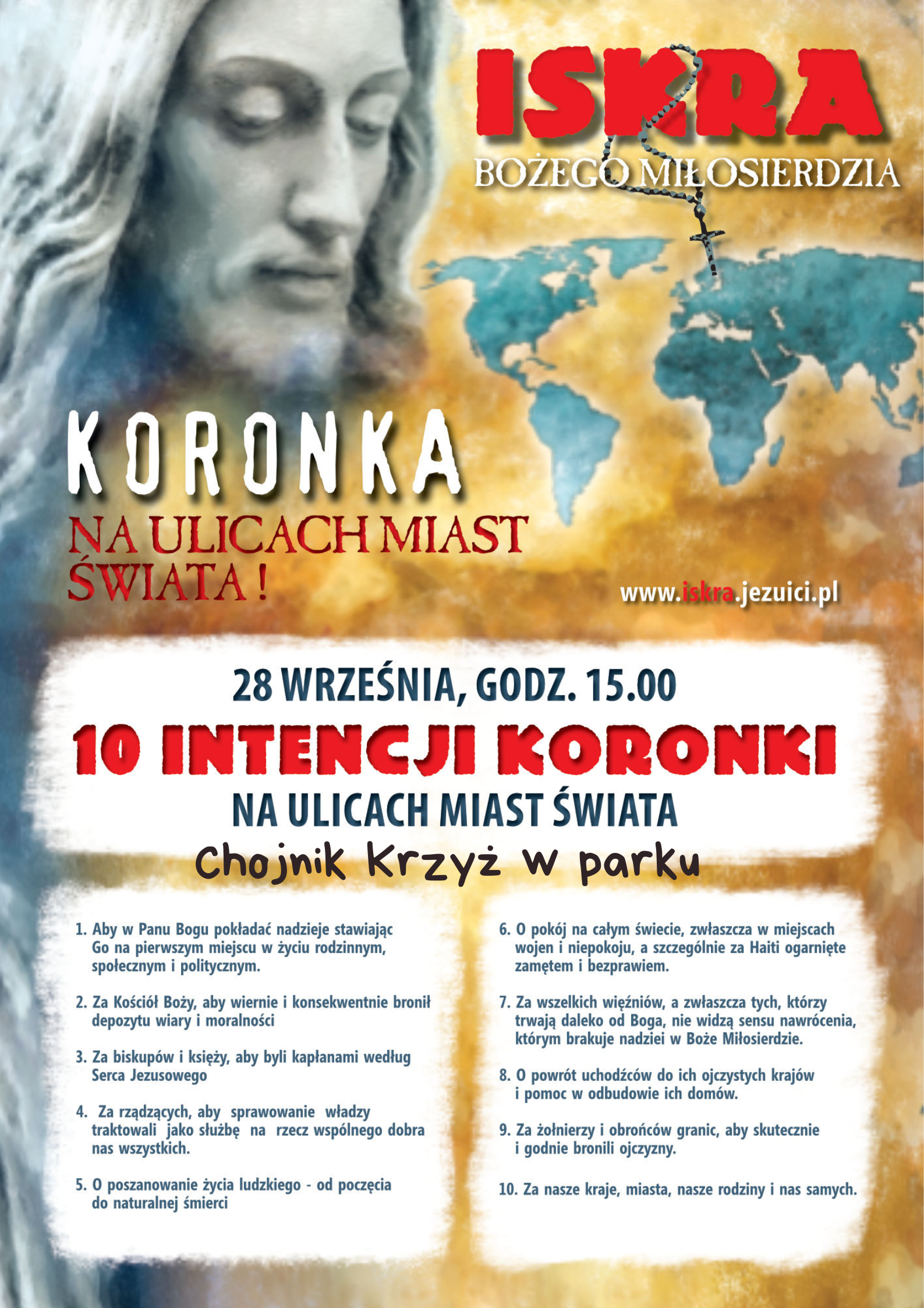 W sobotę, 28 września 2024 r., o godz. 15.00 czciciele Bożego Miłosierdzia już po raz 16 spotkają się na chodnikach, rogach ulic i placach Polski i różnych miast świata, by uczcić Godzinę Miłosierdzia i prosić Boga w modlitwie Koronką do Bożego Miłosierdzia w szczególnie ważnych intencjach. Zapraszamy do wspólnej modlitwy w Chojniku przy Krzyżu w parku.